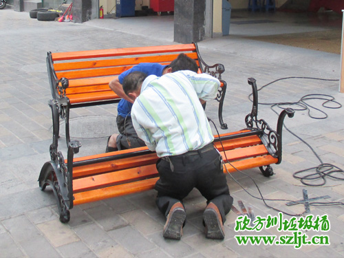 欣方圳員工在細心安裝休閑椅的每一個螺絲,確保客戶放心使用
