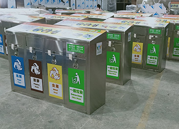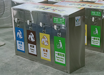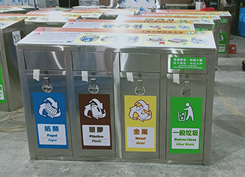 出口香港4分類不銹鋼垃圾桶采用了201#不銹鋼板制作而成,可以選材不銹鋼201、304、316等材質(zhì)制作,整體搖蓋式方形四分類設(shè)計,頂部正面貼了分類標(biāo)識以及廣告宣傳,獨特的鑰匙鎖封閉式方形投口防止異味散發(fā),適合擺放在市政街道、物業(yè)小區(qū)、地鐵站等場景。
