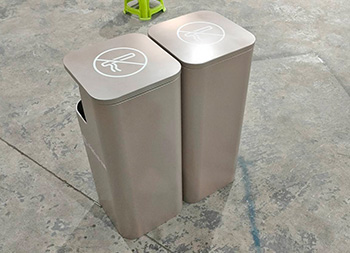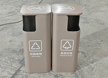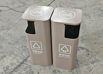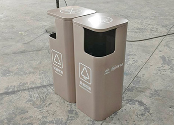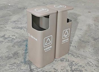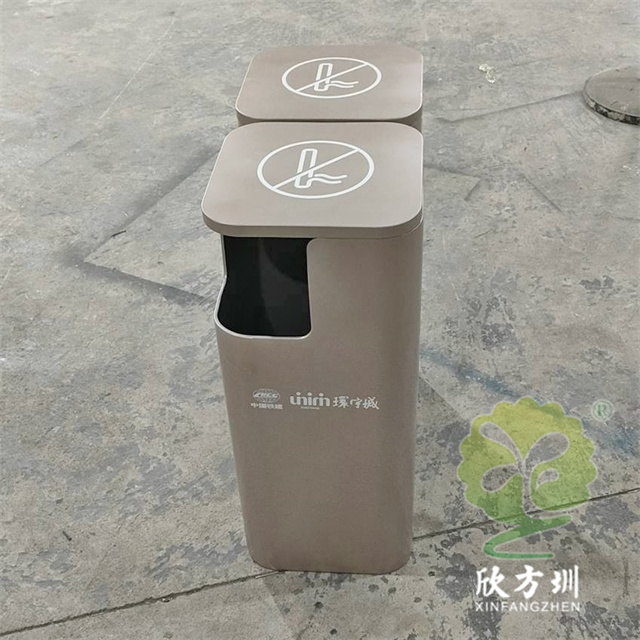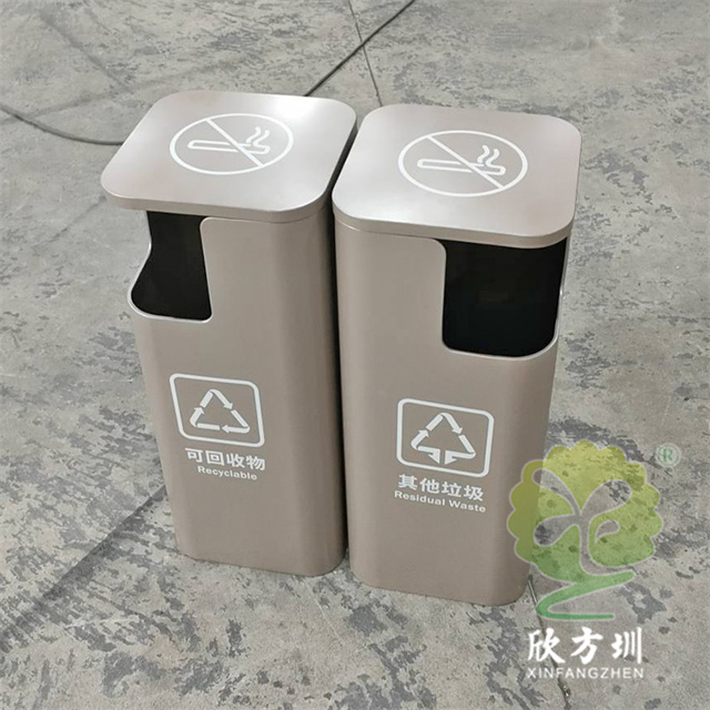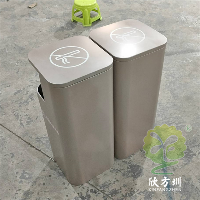 戶外小區(qū)側(cè)投口不銹鋼分類(lèi)垃圾桶采用201不銹鋼板1.2mm厚制造,表面采用淺灰色噴粉上色,組合式分類(lèi)方形左右側(cè)面投口開(kāi)口設(shè)計(jì),油墨絲網(wǎng)印刷國(guó)標(biāo)分類(lèi)標(biāo)識(shí)禁煙標(biāo)識(shí)企業(yè)logo,上方蓋子取出可以取出內(nèi)筒,我們欣方圳可以定制不同的顏色及形狀。
