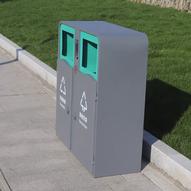 城市街道噴粉不銹鋼分類垃圾桶制作精良,不銹鋼本色戶外連體兩分類方形垃圾桶設計,適合擺放在室內物業(yè)小區(qū)、市政街道、廣場、工業(yè)區(qū)道路或公園景區(qū)等等,注重產品細節(jié)部位處理堅固耐用,安全無利口,不傷手,框架201不銹鋼外筒,不銹鋼內筒也可以選擇鍍鋅板、塑料、玻璃鋼等等,便于垃圾清倒。