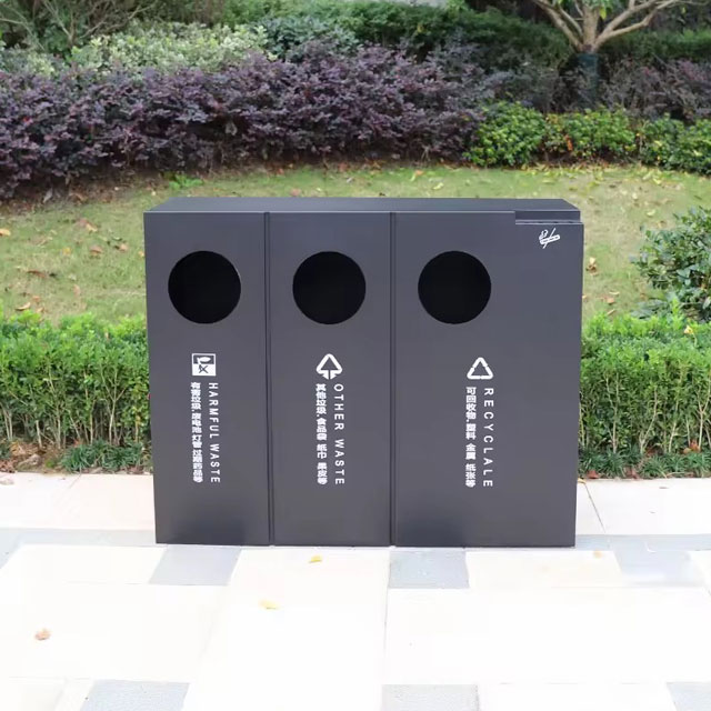 出口公園三分類不銹鋼垃圾桶可以采用201不銹鋼或者304不銹鋼板制造,頂部中心位置凸起出是這款桶創(chuàng)意方形兩連體設(shè)計,正反面油墨絲網(wǎng)印刷最新國標(biāo)分類標(biāo)識和禁煙標(biāo)識,側(cè)面可以定制絲印企業(yè)logo,垃圾桶兩個方形投口中間位置帶滅煙盒,帶三角鑰匙開門方便環(huán)衛(wèi)工人清理內(nèi)置廢物。