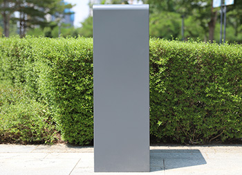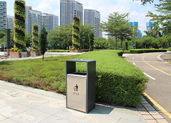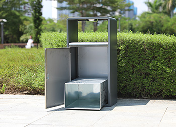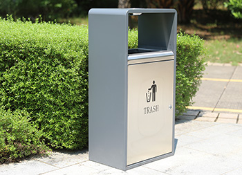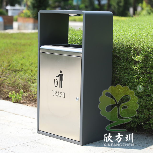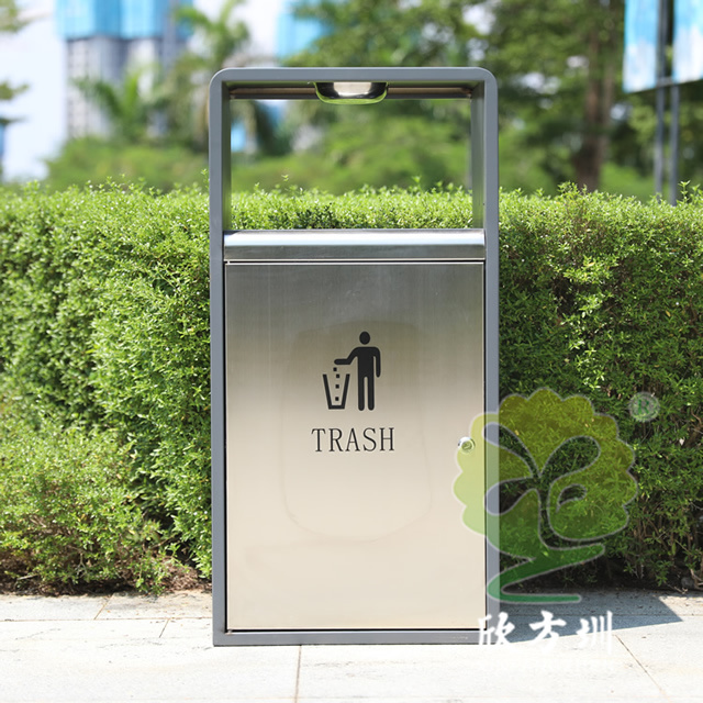 戶外方形單筒不銹鋼果皮箱采用了201不銹鋼板制作而成,也可以使用304不銹鋼板制作,這款果皮箱是一個(gè)國(guó)外的訂單,雙面方形投口設(shè)計(jì),頂部掉一個(gè)碗形的煙灰盅,正反雙面油墨絲印了英文的分類標(biāo)識(shí),垃圾桶外框采用了灰色噴塑工藝,框架看起來比較厚使用了折邊,表面看起來簡(jiǎn)約大氣。