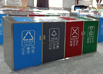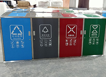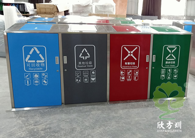 大容量四分類不銹鋼垃圾桶可以采用201、304不銹鋼板制作,戶外方形四分類帶彈蓋設(shè)計(jì),框架不銹鋼本色正面和頂部蓋子采用了不銹鋼高溫烤漆,四色分明分別藍(lán)、灰、紅、綠,絲印了分類標(biāo)識(shí)和指引圖標(biāo),正門三角鑰匙開門旁邊帶把手方便取出內(nèi)筒,可搭配垃圾亭使用。