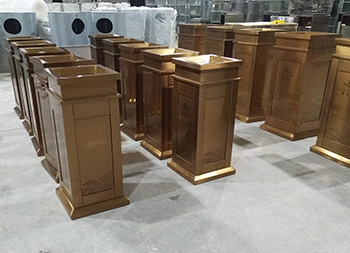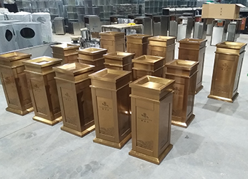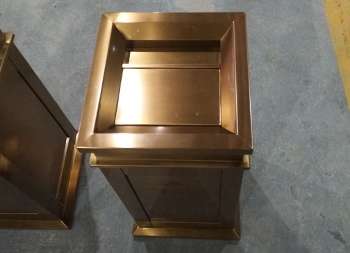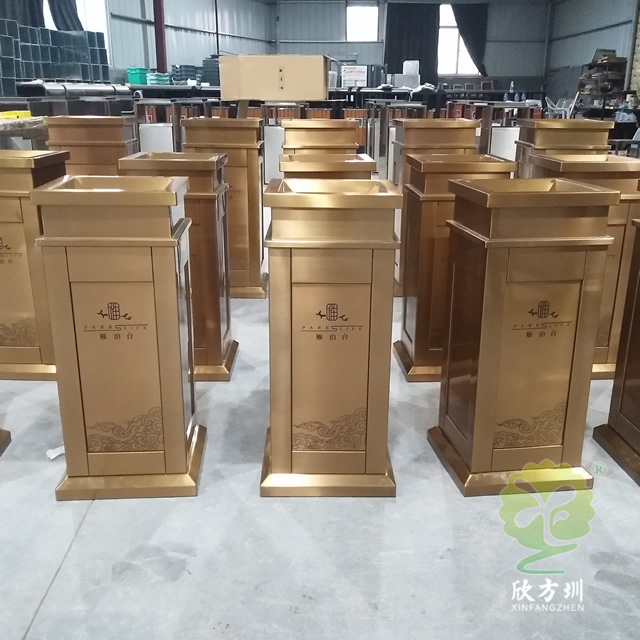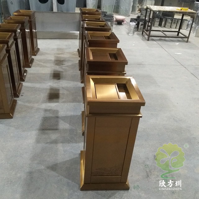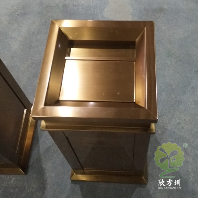 室內(nèi)電鍍方形不銹鋼垃圾桶采用了304不銹鋼裁剪折彎制造而成,室內(nèi)方形立式土豪金搖蓋式設(shè)計,絲網(wǎng)印刷了淡黑色企業(yè)logo,前后左右四塊板刨坑腐刻了裝飾花紋,裝飾花紋也可以采用絲印或者UV打印,這款垃圾桶完美外觀高檔整體奢華。