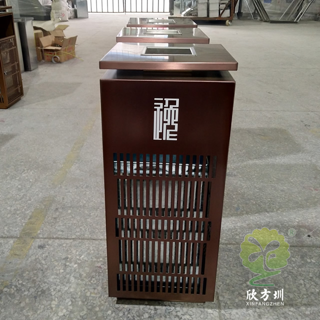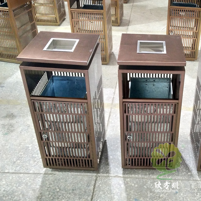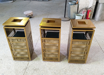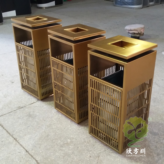 電鍍室內方形不銹鋼果皮箱采用了201不銹鋼板制作而成,激光切割鏤空方形電鍍設計,四面采用了長方形條紋切割鏤空,鏤空并非是減少了成本而是增加了成本,功能是防止積污水,不銹鋼垃圾桶支持電鍍土豪金、香檳金、古銅色等顏色,可以免費絲印企業(yè)logo及名稱等,頂部可以選擇性帶煙灰盅或者不帶,我們是一家專業(yè)做定制的廠家。