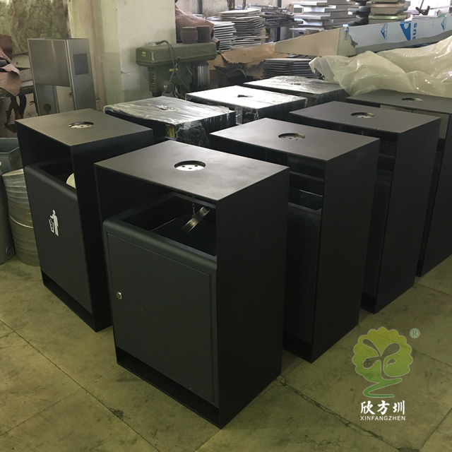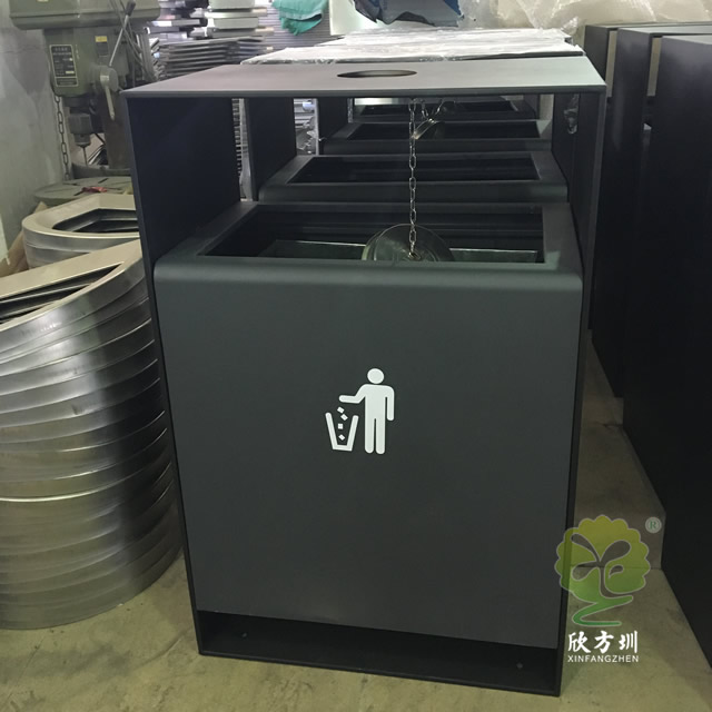 戶外方形噴塑不銹鋼果皮箱采用304不銹鋼厚度足1.0mm內(nèi)桶鋅板0.4mm外框啞光黑,桶身灰色絲網(wǎng)印刷雙面人投標(biāo),雙面投口方形設(shè)計(jì),頂部中心位置帶一個(gè)圓形的煙灰盅,單面垃圾桶門可以使用三角鑰匙開(kāi)門取出框架里面的內(nèi)筒,頂部隔空了幾厘米預(yù)防內(nèi)筒進(jìn)水可以避免潮濕,下面可以膨脹螺絲固定在路面,防止被盜搶或挪動(dòng)。