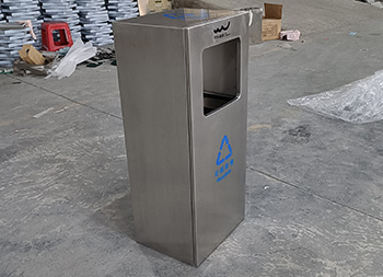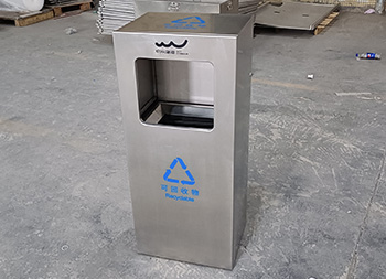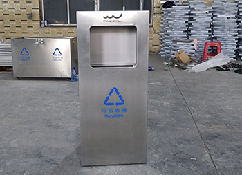 戶外方形滑軌不銹鋼垃圾桶整體桶身內(nèi)筒采用了304#不銹鋼1.0mm厚的不銹鋼板制造而成,高檔簡約方形滑軌式設(shè)計,表面不銹鋼本色啞光,使用了天藍色的油墨絲印了企業(yè)logo以及可回收垃圾,客戶是定制放在垃圾亭回收資源,可以放著戶外做單筒或者電梯口,欣方圳廠家支持室內(nèi)戶外果皮箱定制。
