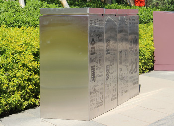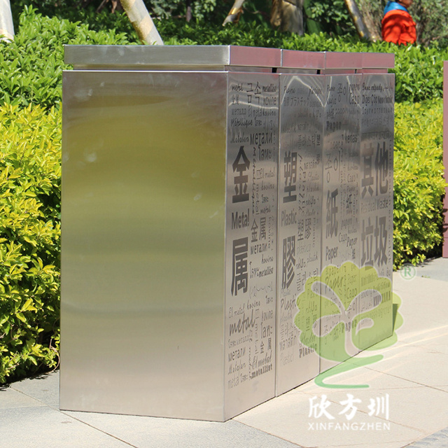 室內創(chuàng)意四分類標識不銹鋼垃圾桶可以選用201或者304不銹鋼板制作,采用立式直投口方形組合式設計,垃圾桶表面不銹鋼本色,正反面采用了黑色油墨絲網印刷了創(chuàng)意分類標識,金屬和塑料桶采用了圓形投口,其他垃圾大型方形投口,廢紙采用了長方形投口,拿出蓋子可以方便的取出里面的鍍鋅板內筒。