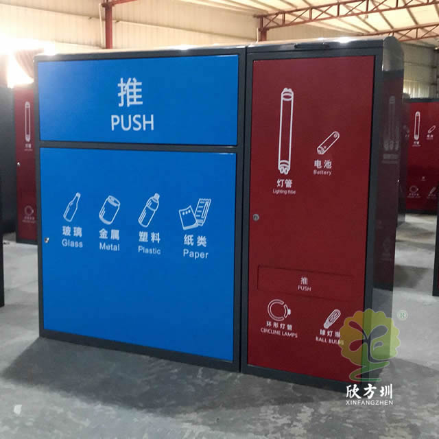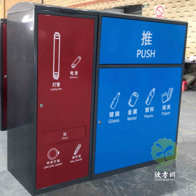 這款組合式不銹鋼分類回收箱采用了201不銹鋼制作而成,方形組合式五分類含蓋資源回收箱設計,垃圾桶框架使用了黑色噴塑,門蓋采用了好色和藍色,絲網印刷了分類回收標示,正面垃圾桶門配備三角鑰匙鎖,分別可以回收玻璃瓶、金屬、塑料、紙類和燈管電池。