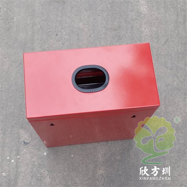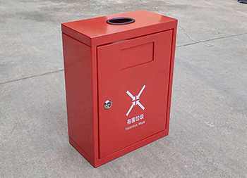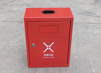 掛壁式不銹鋼有害垃圾回收箱采用0.8mm厚201不銹鋼板制造,也可以采用鍍鋅鐵板制作,方形掛壁式橢圓形直投口設計,金屬表面噴粉烤漆紅色上色,正面采用三角鑰匙可以取出內置的鍍鋅板內筒,投口帶膠墊防止投放時刮傷手掌。