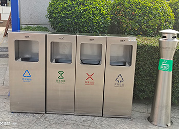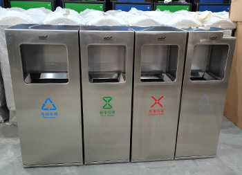 戶外廣場(chǎng)組合式不銹鋼分類(lèi)垃圾桶采用了201不銹鋼板制作而成,四分類(lèi)方形組合式設(shè)計(jì),果皮箱表面啞光,絲網(wǎng)印刷了可回收物、廚余垃圾、有害垃圾、和其他垃圾,投口上方絲印了企業(yè)logo,可回收物的尺寸比其他桶的尺寸需要大一些,其他垃圾桶右上角制作了煙灰柱,方便收集煙頭煙灰。
