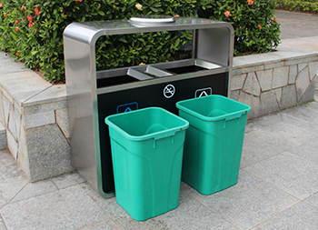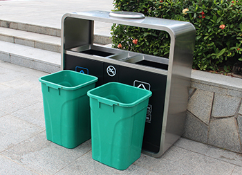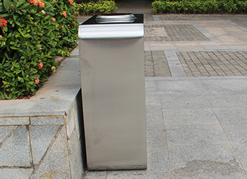 廣州戶外市政街道不銹鋼分類垃圾桶可以采用201不銹鋼或者304不銹鋼板制造,頂部中心位置凸起出是這款桶創(chuàng)意方形兩連體設計,正反面油墨絲網(wǎng)印刷最新國標分類標識和禁煙標識,側面可以定制絲印企業(yè)logo,垃圾桶兩個方形投口中間位置帶滅煙盒,帶三角鑰匙開門方便環(huán)衛(wèi)工人清理內(nèi)置廢物。