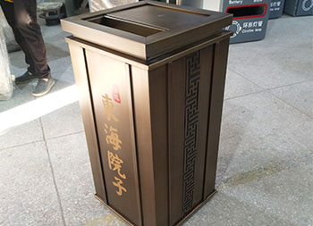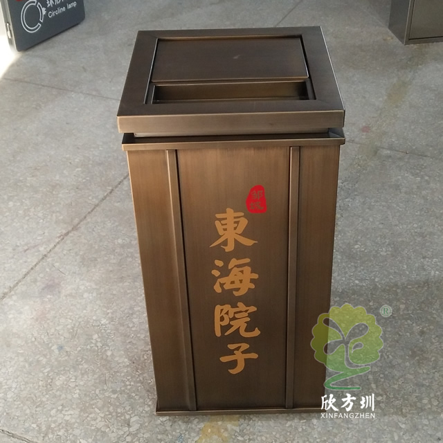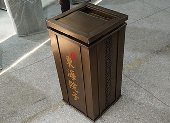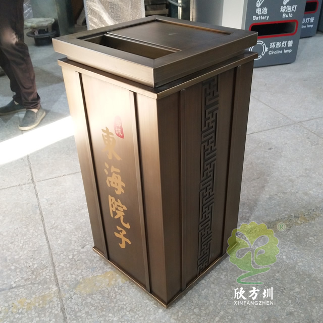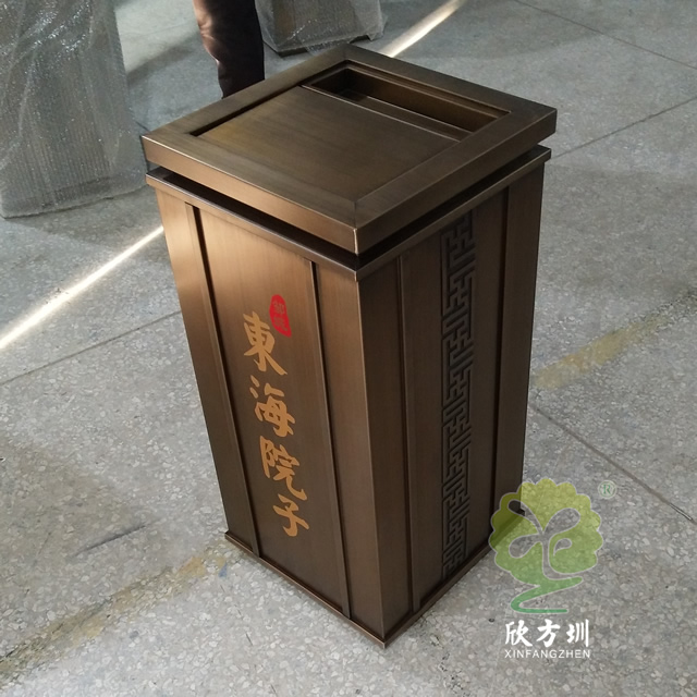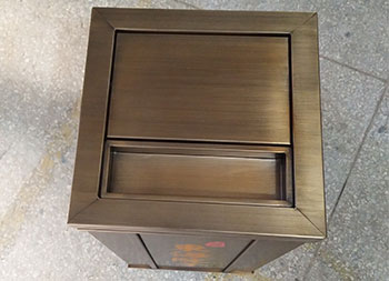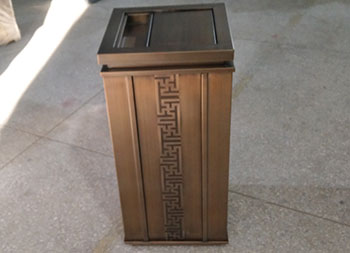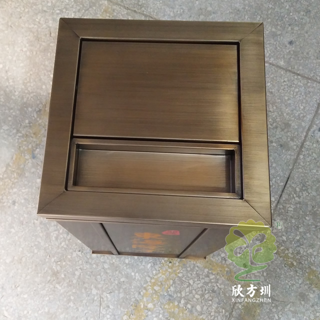 古銅色方形室內(nèi)不銹鋼垃圾桶采用了材質(zhì)201#不銹鋼,前后貼萬字福板,兩側(cè)面絲印,顏色為金色,桶身電鍍古銅色,搖蓋式直投口頂部帶煙灰盅方形設(shè)計,側(cè)面兩邊復(fù)古圖案設(shè)計,我們廠家支持定制可以電鍍其他顏色,可以絲印其他的企業(yè)logo及名稱,此款果皮箱適合擺放高檔場所的電梯口旁邊。