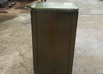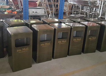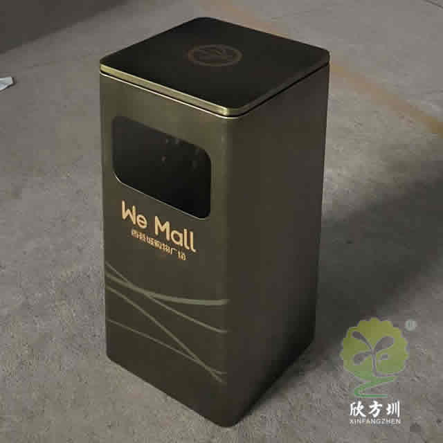 仿青古銅色方形不銹鋼果皮箱采用優(yōu)質(zhì)的304不銹鋼板制作而成,采用了方形單面投口設(shè)計,桶身采用了電鍍仿青古銅色、表面做了防指紋處理、豎條拉絲工藝,頂部桶蓋絲印淡黃色禁煙標(biāo)識,桶身正面絲印了商場企業(yè)logo,垃圾桶桶蓋拿出來可以拿出里面的內(nèi)筒,我們廠家支持垃圾桶定做。