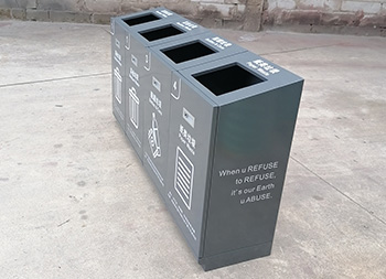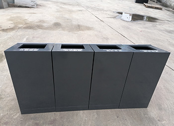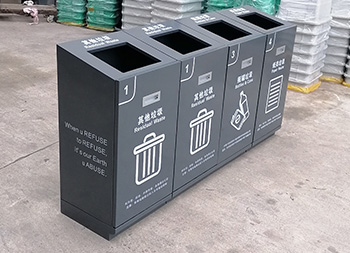 室內(nèi)商用滑軌方形組合式不銹鋼分類垃圾桶外框整體采用了足1.0mm厚的201不銹鋼板制作,坡面方形投口立式直投口單筒方形組合式滑軌設(shè)計,箱體全身深灰色烤漆,底部做了配重,左右兩邊、正面和頂部投口使用了白色油墨絲印中英文分類標識及文字,可以定制其他垃圾、可回收物桶等。
