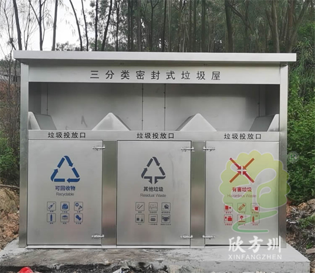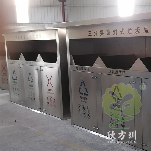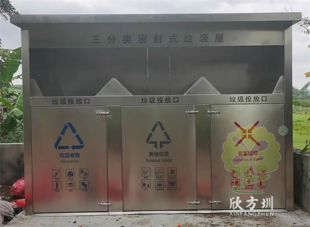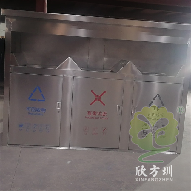 戶外不銹鋼三分類密閉式垃圾屋桶身采用優(yōu)質 201#不銹鋼 1.0mm 厚度生產(chǎn)的,戶外連體三分類屋形設計,絲印單色的分類標識,可回收物藍色油墨,有害垃圾紅色油墨,其他垃圾黑色油墨,頂部和投口都采用了油墨絲印了黑色名稱標識,箱體不帶里面的塑料內筒,內筒是使用常規(guī)240L塑料垃圾桶。