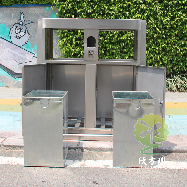 戶外公園雙分類不銹鋼垃圾箱制作精良,兩分類方形高檔設(shè)計(jì),注重產(chǎn)品細(xì)節(jié)部位處理堅(jiān)固耐用,安全無(wú)利口,不傷手,201#不銹鋼外筒,鍍鋅板內(nèi)筒 ,便于垃圾清倒。