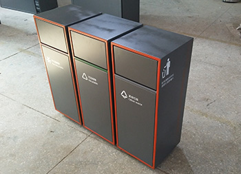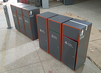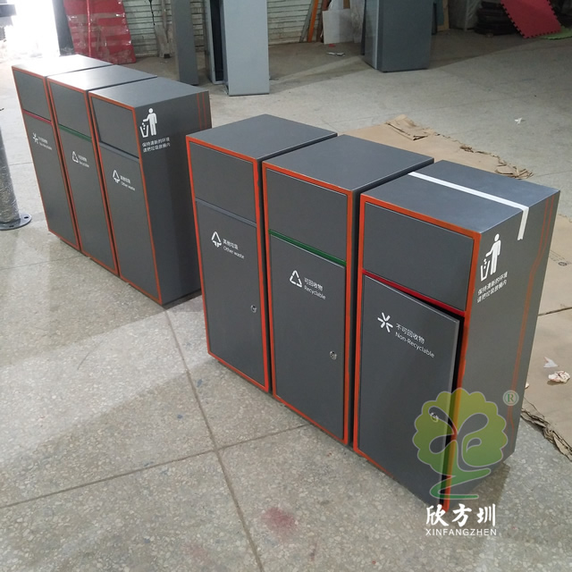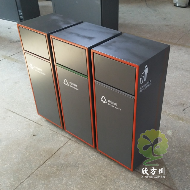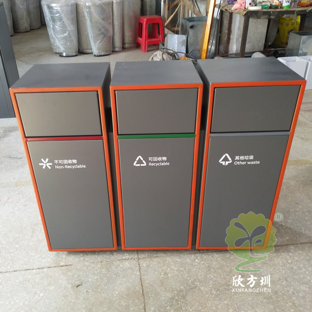 戶外組合式不銹鋼分類果皮箱這款垃圾桶采用了1.0mm厚的201不銹鋼板制作而成,不可回收物、可回收物、其他垃圾三分類組合式方形設(shè)計,桶身整體噴塑深灰色,正反面投口下方小橫條噴塑灰色綠色紅色三種不同的顏色,正面絲印了分類標(biāo)識,左右頂部絲印了人頭標(biāo)和標(biāo)識,,反面三角鑰匙開門這款桶工藝復(fù)雜。