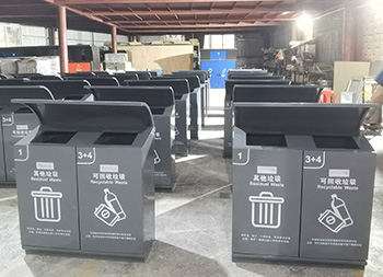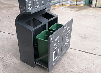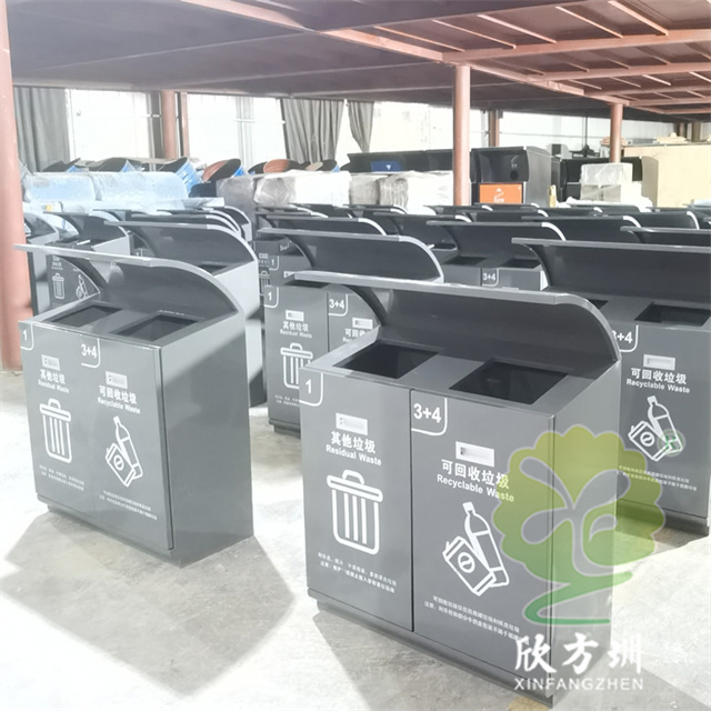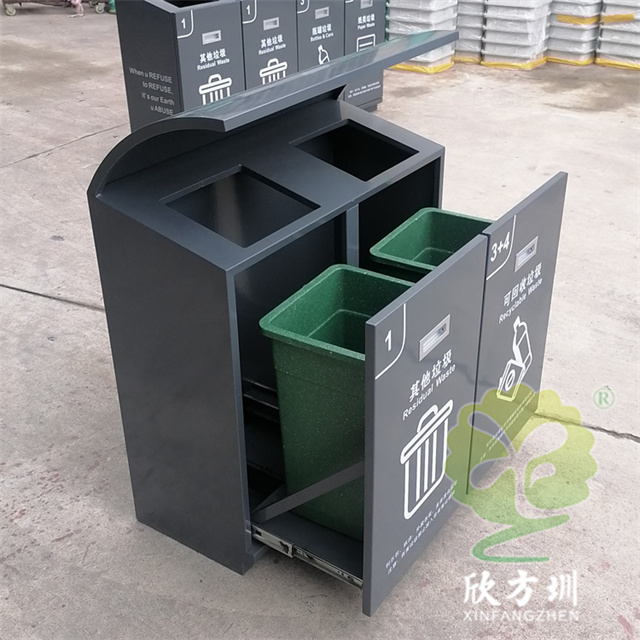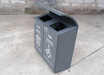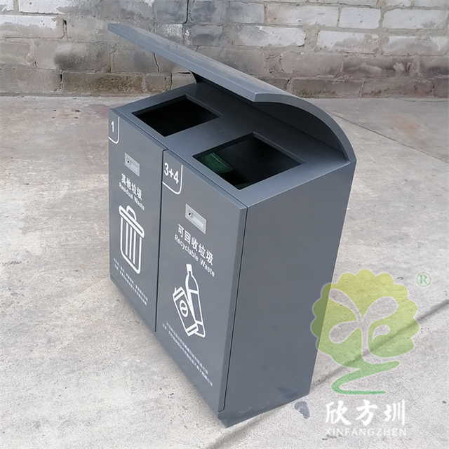 戶外滑軌兩連體不銹鋼分類垃圾桶可以采用201/304不銹鋼板、鍍鋅板、熱軋鋼板制作,方形兩連體滑軌設(shè)計(jì),投口上方帶弧形擋雨棚,桶身表面灰色噴涂噴塑,絲印了白色的其他垃圾和可回收垃圾分類標(biāo)識(shí),正面帶抽拉式把手,欣方圳廠家支持定制。