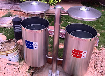戶外圓柱形不銹鋼分類垃圾桶桶身采用了優(yōu)質(zhì)的201#不銹鋼板制造,兩個(gè)圓柱形桶身可回收物、其他垃圾兩分類設(shè)計(jì),底部帶四個(gè)膨脹螺絲孔可以固定在地面,這款垃圾桶的底座部分長可以埋在地面里,桶身整體顏色為不銹鋼砂鋼,分類標(biāo)識(shí)是貼的鋁牌子用膨脹螺絲固定的,投口邊緣是不銹鋼鏡面顏色,取出內(nèi)筒只需要把垃圾桶的擋雨棚往上開就可以輕易的取出內(nèi)筒來。
