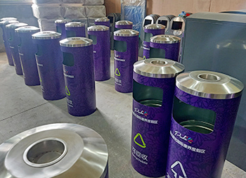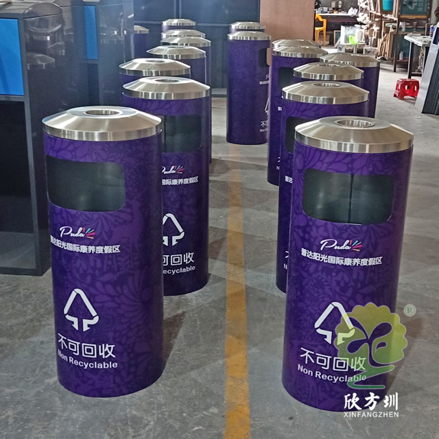 戶外圓柱形分類不銹鋼垃圾桶采用了201#不銹鋼板制造而成,圓柱形組合式雙分類設(shè)計(jì),表面采用了貼紫色貼紙,貼這款貼紙工序繁瑣比較復(fù)雜一般小心就貼歪,單面方形投口,頂部中心位置帶一個(gè)圓形的煙灰盅,這款垃圾桶康養(yǎng)度假中心景區(qū)的擺放在戶外高檔大氣上檔次。