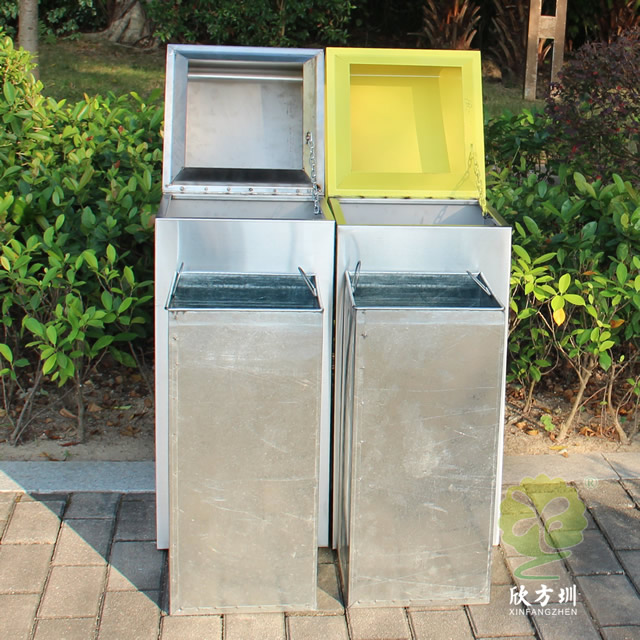 市政街道不銹鋼分類垃圾箱采用了常規(guī)1mm厚的201不銹鋼板制作而成,方形組合式分類設計,正面右上角絲網印刷絲印了分類圖標,桶身整體是不銹鋼本色,桶蓋往后翻可以取出垃圾桶的內筒,桶蓋可回收垃圾噴塑了黃色頂部坡面制作,我們欣方圳廠家支持定制不銹鋼果皮箱。