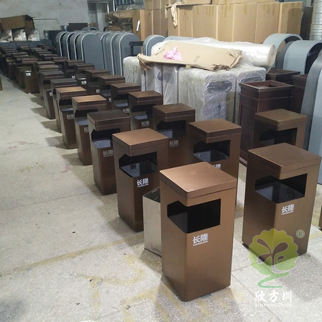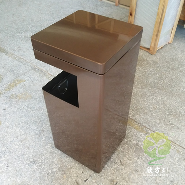 景區(qū)電鍍方形不銹鋼垃圾桶采用了201不銹鋼板制作而成,方形電鍍咖啡色單筒設計,頂部邊角L型開口制作廢物投口,投口下方使用了絲網(wǎng)印刷了白色企業(yè)名稱,頂部有個凹槽可以取出拿出里面的內筒方便清潔工清理桶內的廢物,這款果皮箱適合室內外使用,我們欣方圳可以根據(jù)您的要求定制金屬果皮箱、玻璃鋼垃圾桶等,專業(yè)生產景區(qū)果皮箱的廠家。