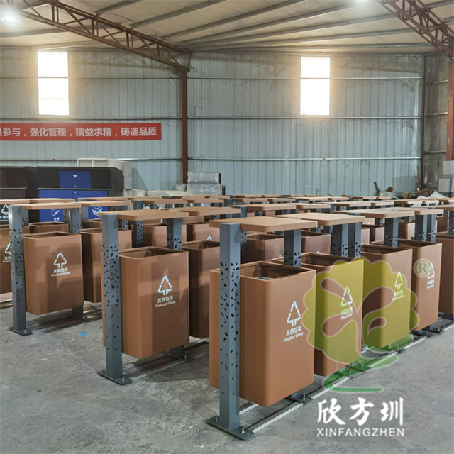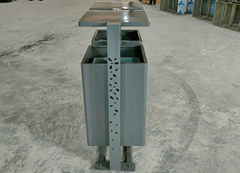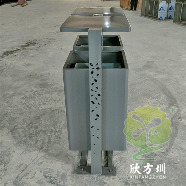 戶外景區(qū)鏤空立柱不銹鋼分類垃圾桶整體材質(zhì)采用201#不銹鋼桶身1.0mm,三根立柱80*80*1.0mm厚度表面圖案鏤空,垃圾桶底板足4.7mm不銹鋼板能,夠良好避免大風(fēng)吹倒人為破壞傾斜,立柱噴塑烤漆灰色,大貨用戶做的深黃色,用戶打樣品是整體噴塑烤漆深灰色,能夠良好的避免垃圾桶清晰擦拭的困難,景區(qū)回收箱無(wú)滅煙處設(shè)計(jì)。