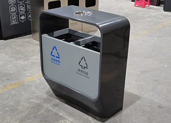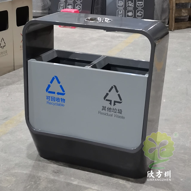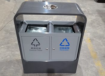戶外噴塑不銹鋼分類垃圾桶采用了201#型號(hào)1.0厚的不銹鋼板制作而成,方形兩分類設(shè)計(jì),兩種顏色噴塑灰色、灰白搭配,底部創(chuàng)意設(shè)計(jì)小斜口坡面,頂部中心位置帶一個(gè)圓形煙灰盅,正面絲印了可回收物和其他垃圾,正面三角鑰匙開(kāi)門可取出設(shè)備里面的內(nèi)筒。