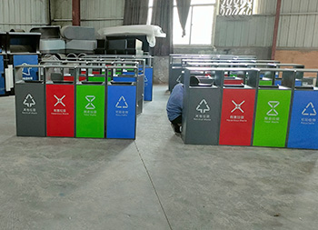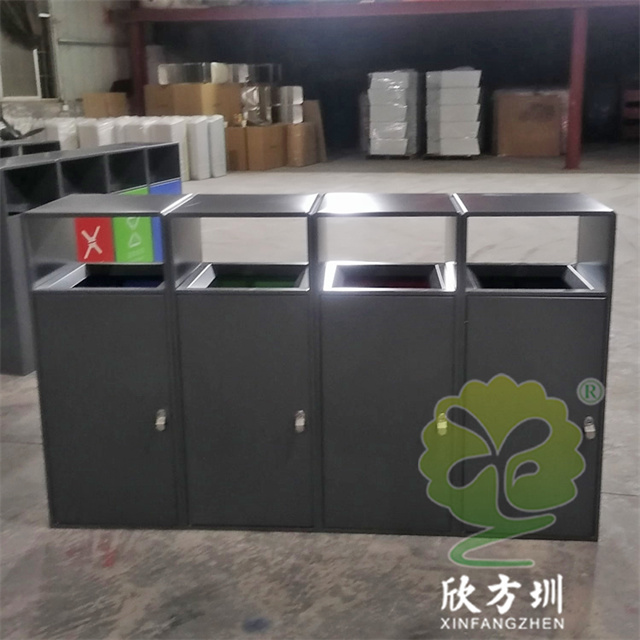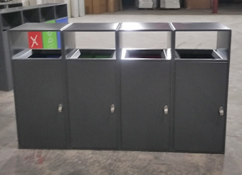 戶外噴塑四色不銹鋼分類(lèi)果皮箱垃圾桶采用了201#不銹鋼1.0mm厚的板生產(chǎn)而成,桶身表面噴塑烤漆了灰色,正面門(mén)板噴塑烤漆了四種顏色,分別有其他垃圾灰色、有害垃圾紅色、廚余垃圾綠色、可回收物藍(lán)色,背面可使用三角鑰匙取出內(nèi)筒,方形連體無(wú)煙灰盅設(shè)計(jì),這款產(chǎn)品支持定制兩分類(lèi)三分類(lèi)以及單筒。