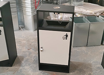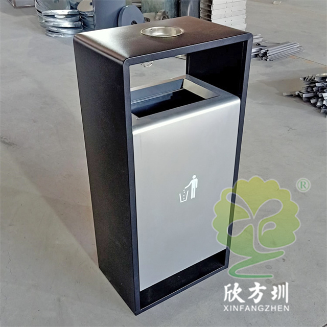 戶外熱銷方形簡(jiǎn)易不銹鋼垃圾桶可以選用不銹鋼或者鍍鋅板制作,這款果皮箱框架噴涂黑色塑粉桶身噴塑銀色,表面可以根據(jù)用戶要求定制,頂部中心位置帶圓形的煙灰盅,投口帶折邊,桶身離地面比較高也有效避免雨水進(jìn)入,可以絲印logo人頭標(biāo)或分類標(biāo)識(shí)。