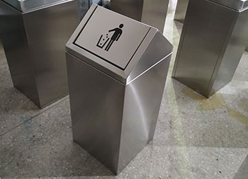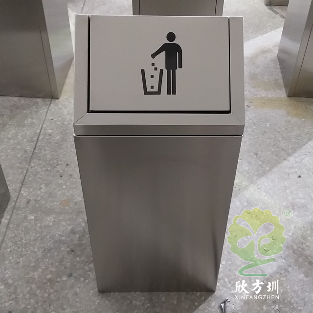 商場單筒搖蓋式不銹鋼垃圾桶采用304#不銹鋼板制作而成,屋形搖蓋式方形設(shè)計(jì),這款果皮箱表面采用了啞光處理,表面處理有電鍍、烤漆、防指紋處理、拉絲、UV打印等可以根據(jù)客戶要求提供定制,頂部絲印了投遞垃圾的圖標(biāo),或者客戶自己提供企業(yè)logo我們可以印刷上去。