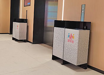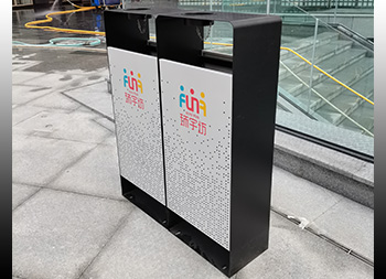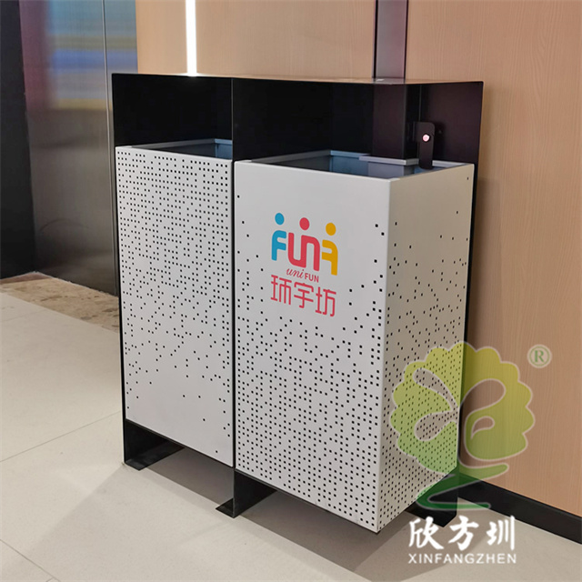 商場廣場鏤空加厚不銹鋼分類垃圾桶可以選擇用鍍鋅板、冷軋鋼板或者不銹鋼板制造,這款垃圾桶框架比較厚實能夠防止割到手,表面噴涂噴塑俗稱噴粉,外部框架噴塑黑色箱體噴塑淺灰色,箱體圓點鏤空,這款垃圾桶是一家商場定制了兩款,一款用于商場室內(nèi)一款用于戶外的廣場,桶身正反面絲印的企業(yè)的分類標(biāo)識。