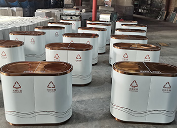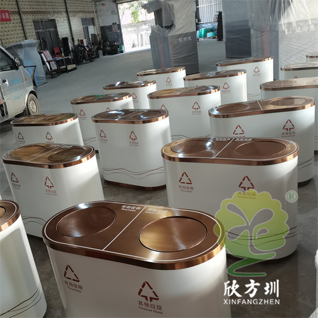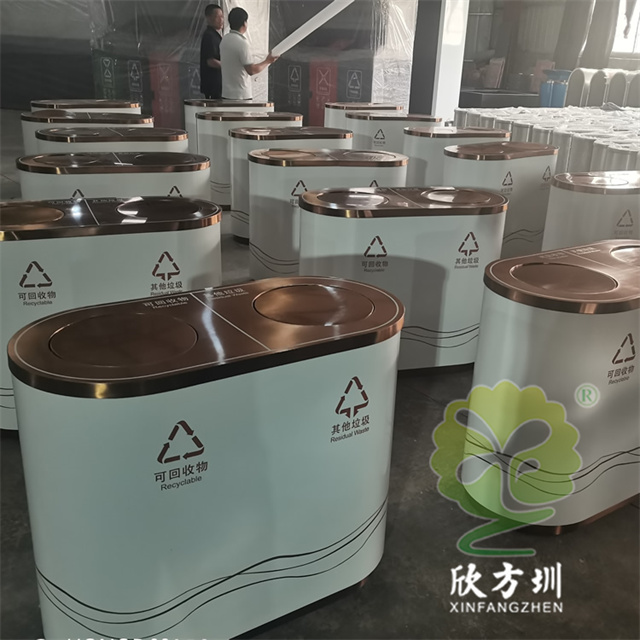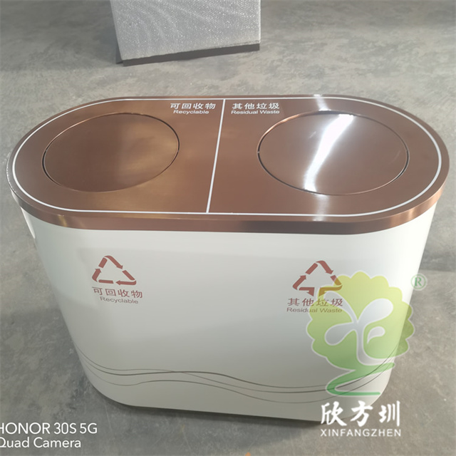 商用帶蓋不銹鋼分類垃圾桶材質(zhì)可以選擇201、304不銹鋼板或者其他金屬板制作,連體兩分類橢圓形帶搖擺蓋設(shè)計,蓋子和桶身電鍍了香檳金和米白色,桶身正反面和上方蓋子絲印了分類標(biāo)識,方便區(qū)分垃圾桶的垃圾分類,這款垃圾桶可以本色或者三分類四分類的,我們廠家支持定制歡迎聯(lián)系。