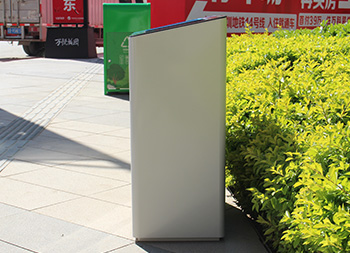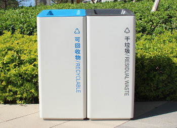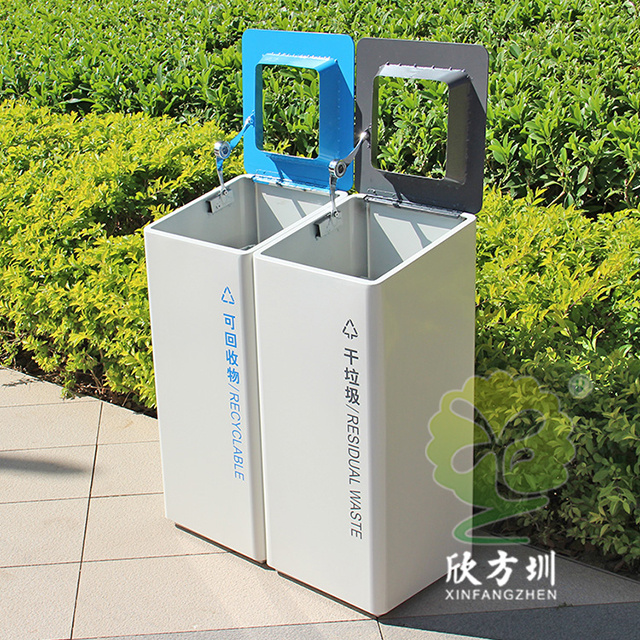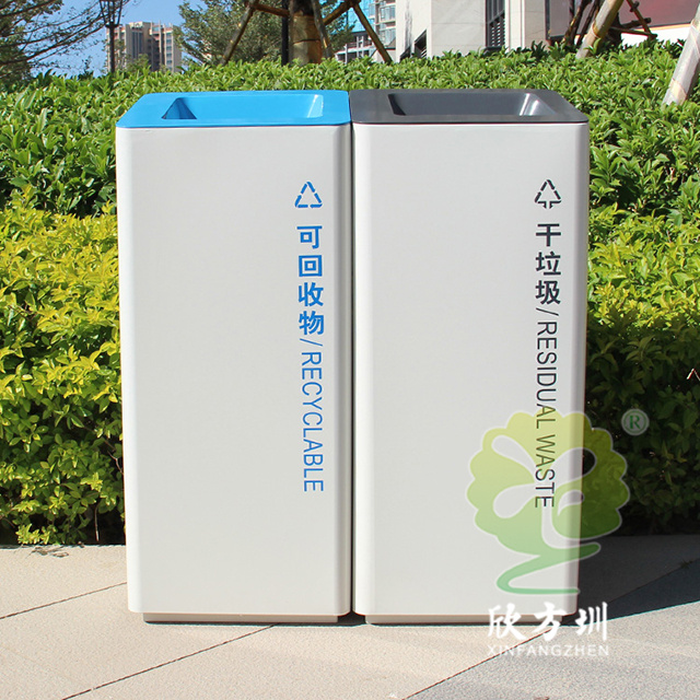 室內(nèi)噴塑不銹鋼分類垃圾桶采用了201#不銹鋼板制造而成,立式直投口方形兩分類組合式設計,桶身整體噴塑了米白色,可回收物標識采用藍色絲印的桶蓋也是藍色,干垃圾標識和蓋子采用了灰色油墨絲印,能夠有效的區(qū)分標識進行有效的分類,方形大號投口桶蓋液壓撐桿開蓋方式方便取出內(nèi)筒進行清理。