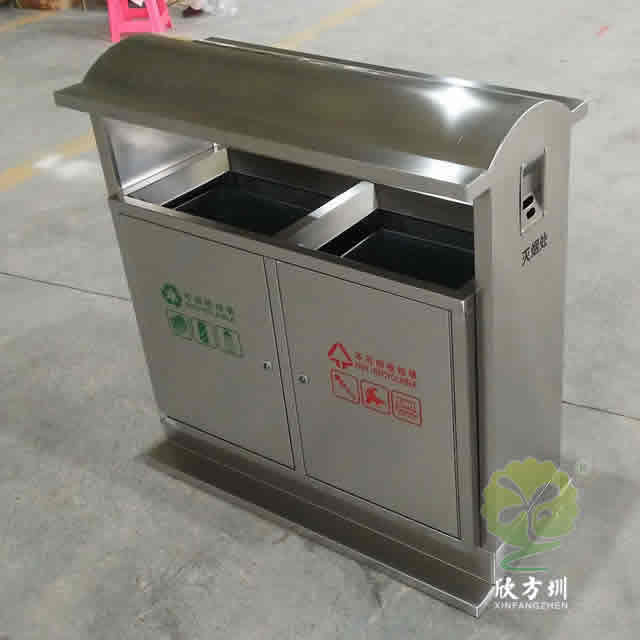 戶外社區(qū)雙分類不銹鋼垃圾箱這款垃圾桶采用了201不銹鋼板制作而成,方形不可回收物、可回收垃圾兩分類雙面投口坡面擋雨棚設(shè)計,左右頂部帶煙灰盅方便投遞煙頭和處理煙灰,避免垃圾桶內(nèi)著火,底部大型底座擺放穩(wěn)定,桶身正反面絲網(wǎng)印刷了垃圾分類標(biāo)識,左右頂部絲印了滅煙處,我們廠家支持定制。