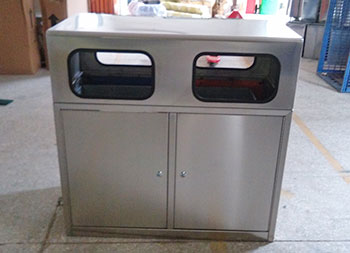 雙面投口方形不銹鋼分類垃圾箱采用201#優(yōu)質(zhì)不銹鋼材料模壓成型,內(nèi)筒采用鍍鋅板,堅固耐用,不易破損;耐火安全,抗高低溫,適合各種惡劣氣候條件;雙分類正反兩面投口無煙灰盅設(shè)計,簡潔方形正面拉門設(shè)計。