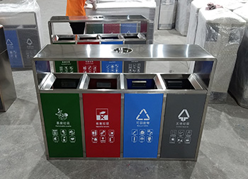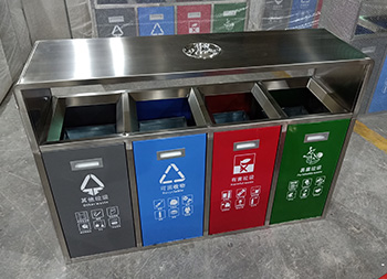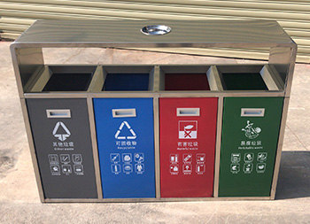 城市街道四色不銹鋼分類垃圾桶可以選用201/304不銹鋼板制作,戶外方形四分類設計,正面門板采用了磁吸式下拉開門可以取出內(nèi)筒,四個門板使用了四種噴塑顏料上色,噴塑了灰色、藍色、紅色、綠色絲印對應的國家最新分類標識,開料前期頂部可以選擇性需不需要煙灰盅,可以定制兩分類、三分類、五分類的這款垃圾箱。