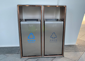 戶外電鍍香檳金不銹鋼分類垃圾桶采用了201#不銹鋼板制作而成,兩連體方形分類抽拉式滑軌設(shè)計(jì),垃圾箱桶身整體為金色本色,內(nèi)框架采用了電鍍香檳金邊框,雙面投口外桶資訊位置絲印單色的最新國標(biāo)分類標(biāo)識,可回收物油墨絲網(wǎng)印刷了藍(lán)色、其他垃圾油墨絲網(wǎng)印刷了灰色,這款垃圾桶高檔輕奢美觀大氣。