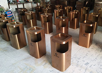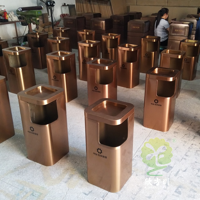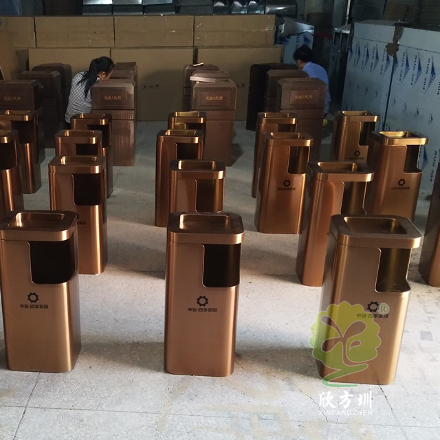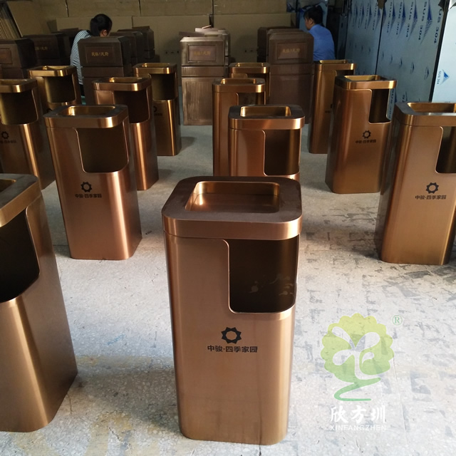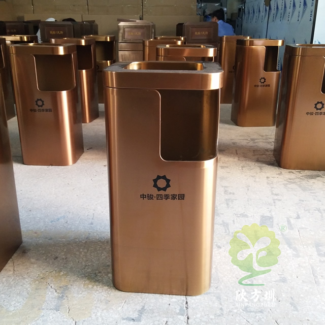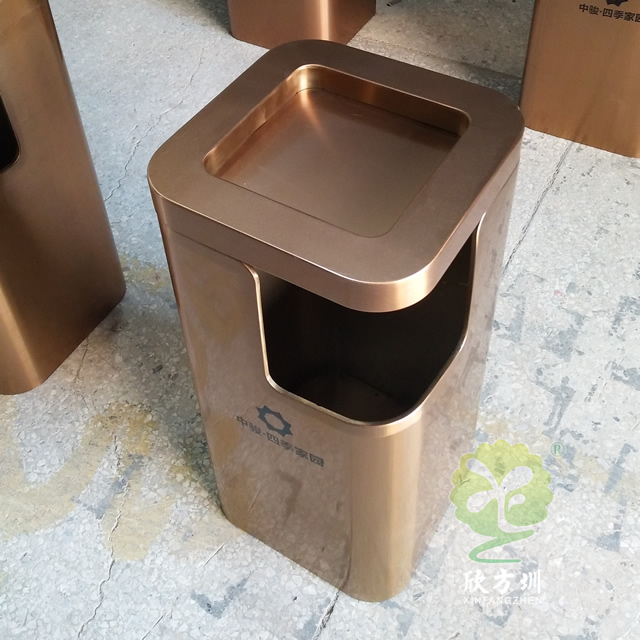 小區(qū)電梯口方形不銹鋼果皮箱采用了優(yōu)質(zhì)201#不銹鋼板折彎焊接成型制作的,這款垃圾桶采用了電鍍玫瑰金,我們工廠支持定制,同樣采購也可以選擇不銹鋼本色、香檳金、土豪金等的顏色,頂部帶煙灰盅平面圓角座設(shè)計可以放滅煙石,適合高檔場所物業(yè)小區(qū)、酒店等地方電梯口擺放。