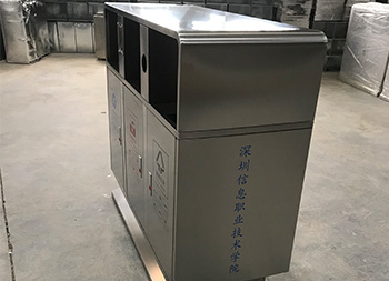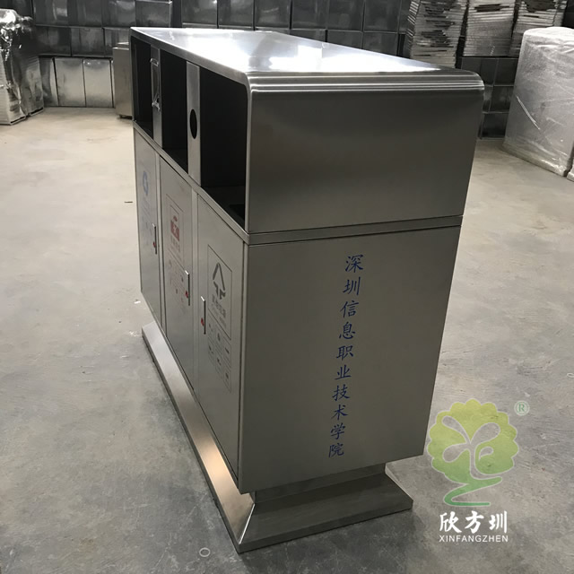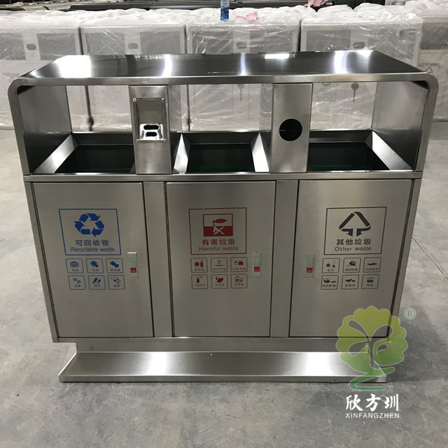 戶外校園環(huán)衛(wèi)三分類不銹鋼垃圾桶采用優(yōu)質(zhì)的201不銹鋼板裁剪折彎拼接焊接打磨而成,此款垃圾桶采用雙面投口三分類可回收物、有害垃圾、其他垃圾設(shè)計(jì),投口上端帶一個(gè)廢電池和滅煙處小型投口方便收集煙頭和廢電池,垃圾箱頂部平滑設(shè)計(jì),可以絲印垃圾分類標(biāo)識(shí)logo及企業(yè)名稱。