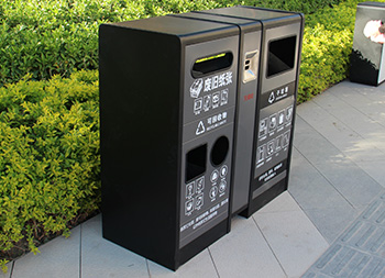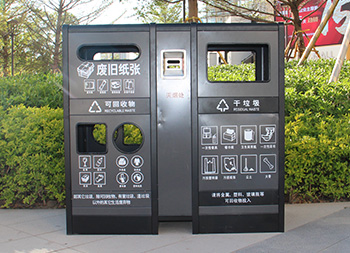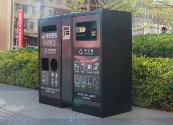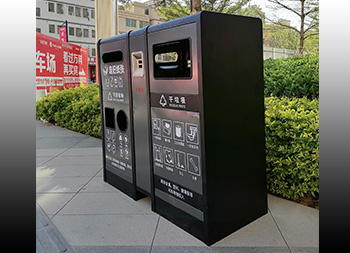 室內(nèi)寫字樓不銹鋼分類垃圾箱采用201不銹鋼1.0mm厚的板制作而成,雙面投口方形兩連體方形四分類設(shè)計(jì),箱體采用了黑色跟灰色配色,桶門板用油墨絲網(wǎng)印刷了兩個(gè)大類分類標(biāo)識(shí),分別干垃圾和可回收物,可回收物有三個(gè)投口分別采用方形、長(zhǎng)方形和圓形開(kāi)口可以區(qū)分不同可回收物,正反面中心位置帶一個(gè)滅煙盒方便煙民抽煙使用,有效避免垃圾桶著火。