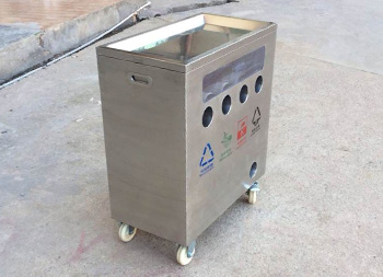 幼兒園訓(xùn)練分類不銹鋼垃圾桶這款垃圾箱材料201新料不銹鋼板制作而成,方形四分類底部帶輪子投口圓形設(shè)計(jì),正面絲印了可回收物、廚余垃圾、有害垃圾其他垃圾的分類標(biāo)識(shí),左右頂部帶把手發(fā)布抬動(dòng),底部四個(gè)滑輪方便推動(dòng),桶內(nèi)四個(gè)塑料管道無內(nèi)筒,是一款學(xué)校訓(xùn)練培訓(xùn)養(yǎng)成垃圾分類的垃圾箱。