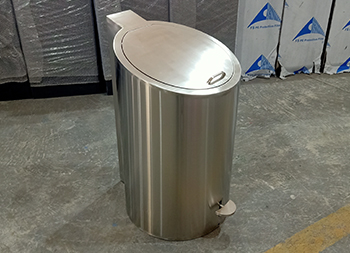 室內(nèi)圓柱形腳踏式不銹鋼垃圾桶使用了201不銹鋼板裁剪打磨拋光生產(chǎn)而成,采用了圓柱形腳踏式設(shè)計(jì)制作,不銹鋼外桶表面白色亮光處理,頂部投口斜口設(shè)計(jì),桶蓋帶帶把手設(shè)計(jì),可以手提把手開蓋或者使用腳踏式開門投遞廢物到桶內(nèi),后面長方形柱子包裹了腳踏式的拉桿,內(nèi)筒是圓柱形的呆提手。