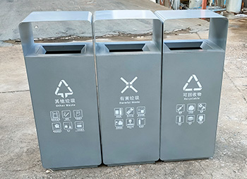 戶外自由組合三色不銹鋼分類垃圾桶使用了201#不銹鋼板制作,外部框架采用了2.5mm厚,桶身采用了1.0mm厚的不銹鋼板裁剪折彎制造,單筒雙面?zhèn)让嫱犊诜叫卧O(shè)計(jì),可以任意自由組合分類,外部框架噴塑灰色,門(mén)板正反面噴塑了不同的顏色,可回收物噴塑淡藍(lán)色、有害垃圾噴塑天藍(lán)色、其他垃圾噴塑了淡灰色,可以組合制作兩分類、四分類、五分類。