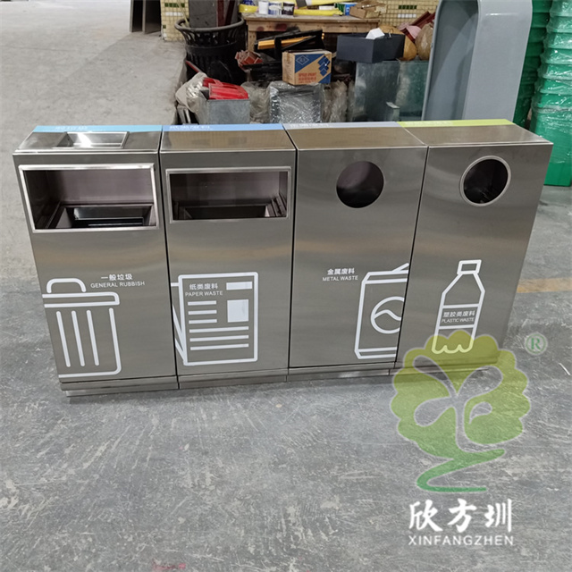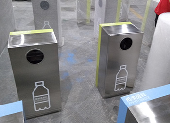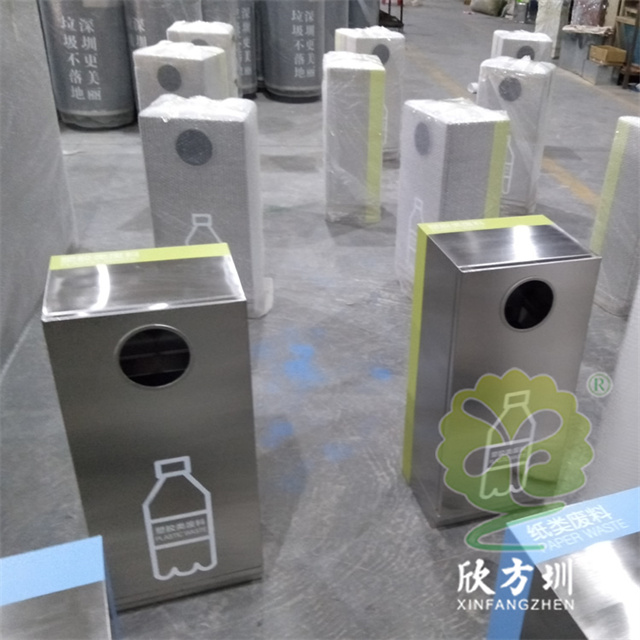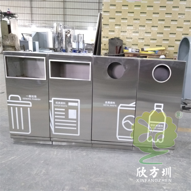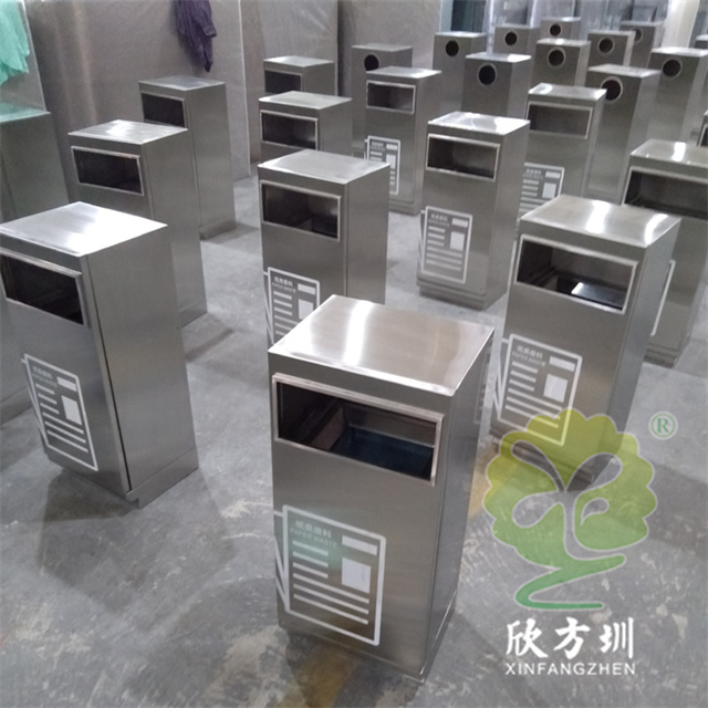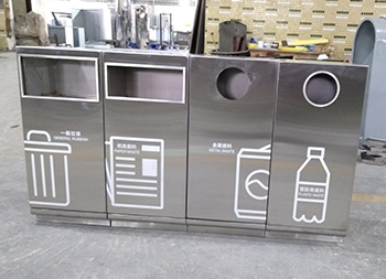 戶外組合式滑軌抽拉式不銹鋼分類垃圾桶可以采用201/304不銹鋼,表面可以采用電鍍或噴塑處理,投口采用方形或圓形開口設(shè)計,上方可以選擇性方形煙灰盅設(shè)計,正面抽拉式滑軌開門可以取出內(nèi)膽,表面絲網(wǎng)印刷大號分類標(biāo)識。