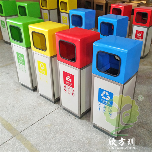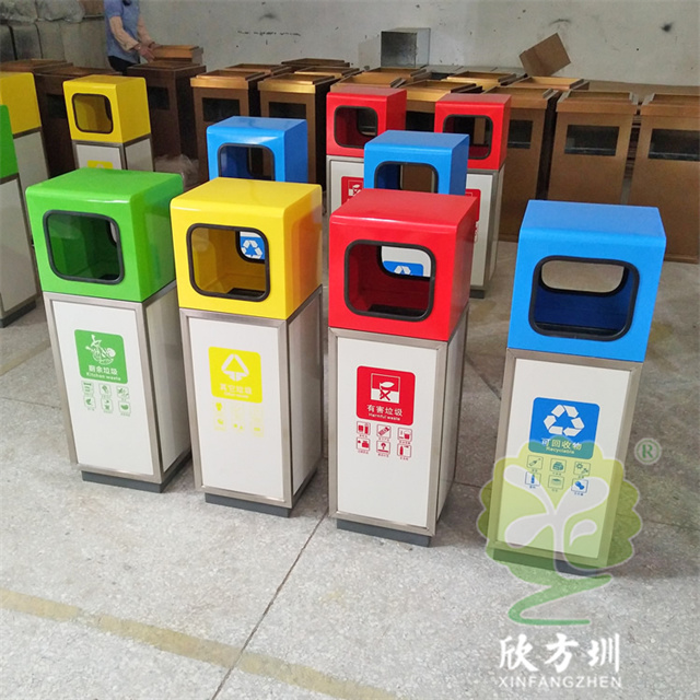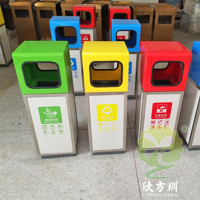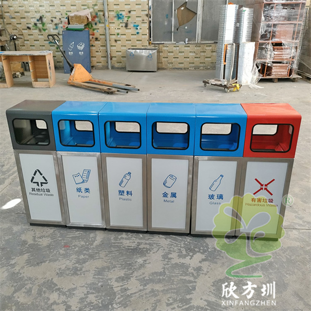 戶外組合式不銹鋼分類垃圾桶圖片桶身使用了201#不銹鋼1.0厚的板材制造,產品型號:E203-3,產品型號:產品規(guī)格:300*300*900mm,雙面投口方形單筒組合式擺放分類設計,表面采用了多色彩噴塑可以按照用戶需要烤漆,可絲網印刷玻璃、金屬、塑料、紙類、其他垃圾、有害垃圾等最新國標分類標識,取出頂部投口可取出內置的內筒方便清理廢物,內筒材質采用了鍍鋅板常規(guī)內筒。