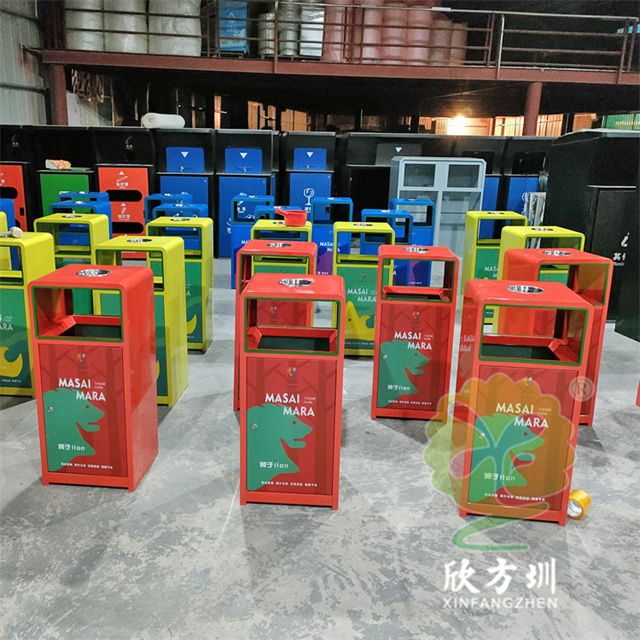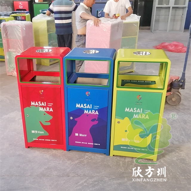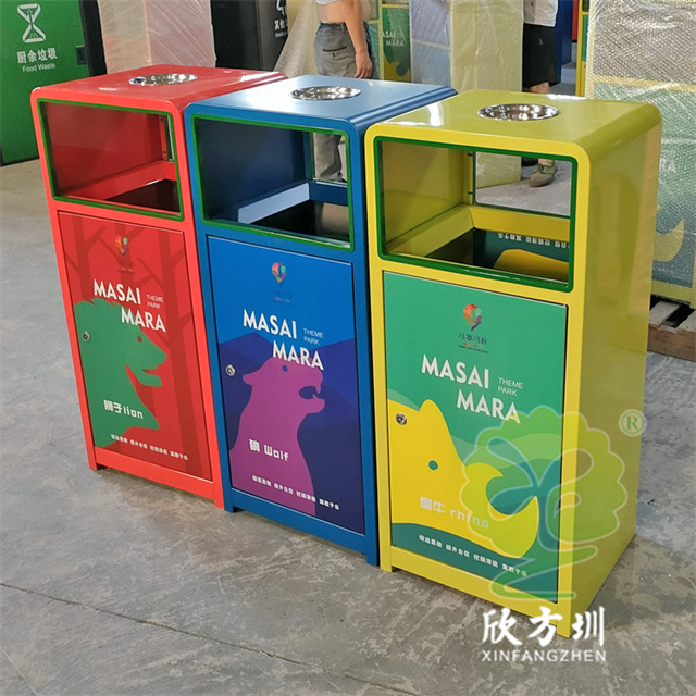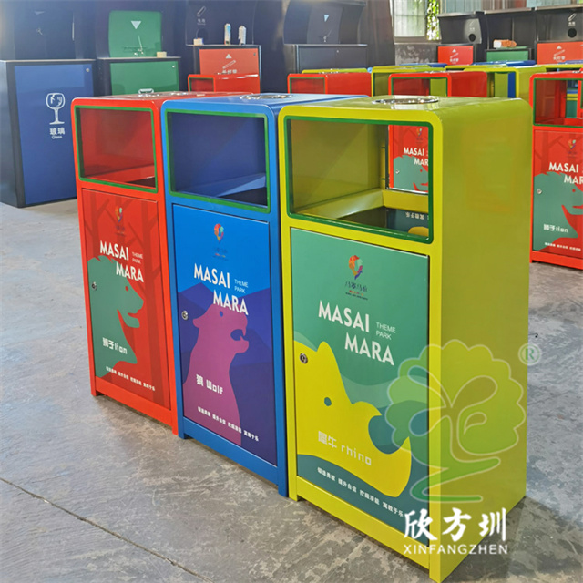 戶外組合式彩色不銹鋼分類垃圾桶采用了2.00mm厚304#不銹鋼板制造而成,一般常規(guī)的不銹鋼板厚度我們廠家都會使用1.00mm厚,室外組合式方形雙面投口設(shè)計,圖片垃圾桶表面采用了三色噴涂噴塑上色,垃圾桶門板應(yīng)用了UV打印抽象卡通圖案,頂部中心位置帶碗形煙灰盅,門板左中間帶三角鑰匙鎖頭,我們廠家支持板材、厚度、表面工藝定制。