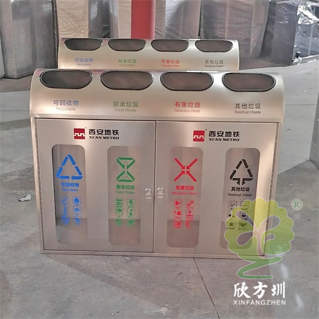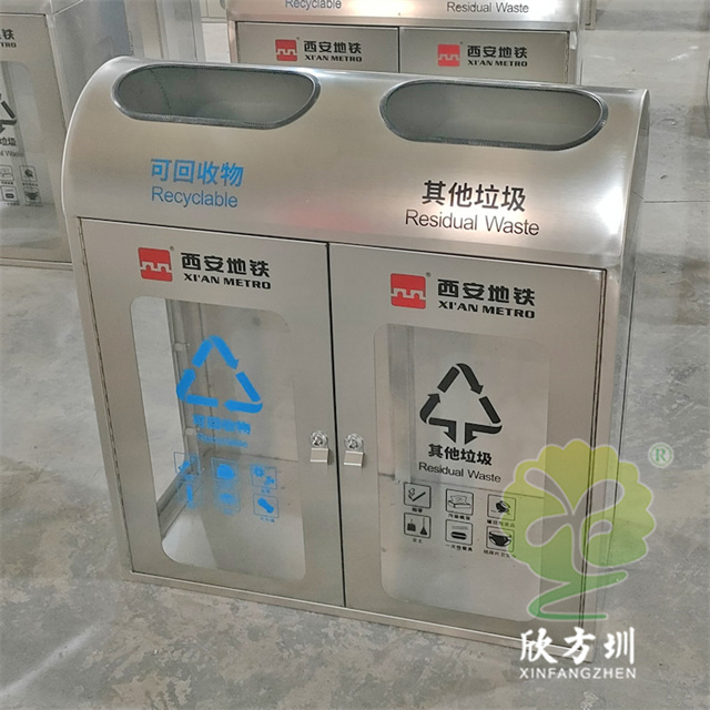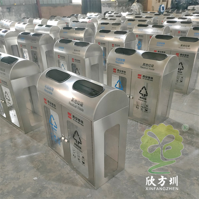 西安地鐵站透明不銹鋼分類垃圾桶外筒201不銹鋼,類型:C903,尺寸標(biāo)準(zhǔn):800*370*850mm/1100*370*850mm,1.2mm厚度(足1.12mm)用戶定制了兩種標(biāo)準(zhǔn)兩分類和四分類的,這款果皮箱不含內(nèi)筒,桶身正面開門,正面和兩個旁邊面有通明亞克力板4mm厚度(足3.75mm),桶身正面絲印分類標(biāo)識和西安地鐵的LOGO,投口粘黑色膠條有效避免割到手,可以打木架或者紙箱包裝,帶導(dǎo)軌和繃簧。