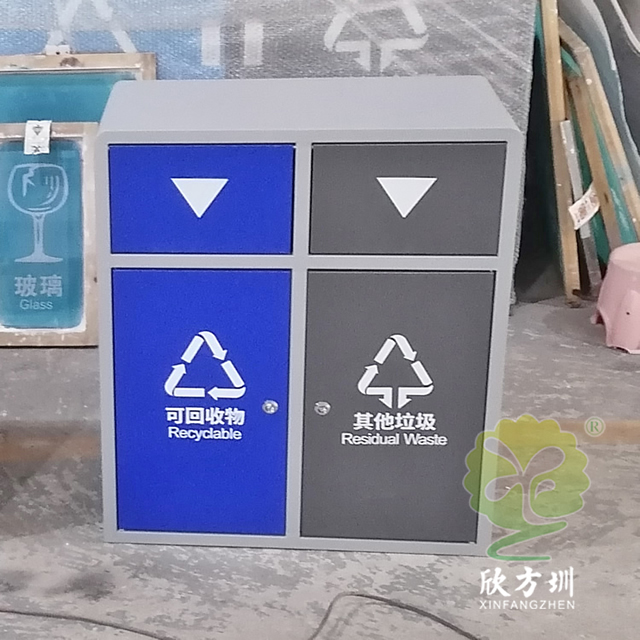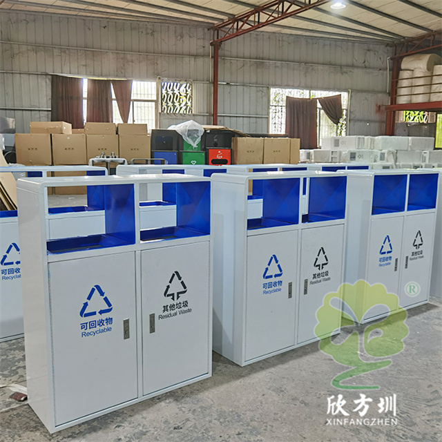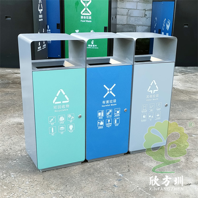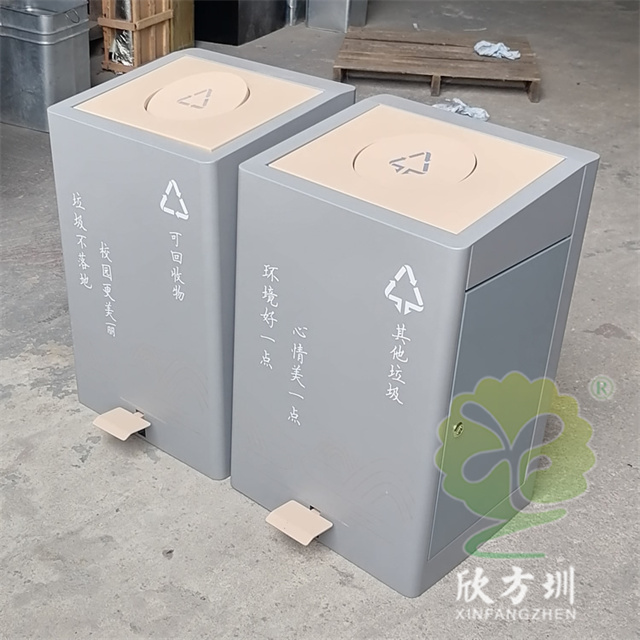 戶外學(xué)校廣場分類垃圾桶圖片,這些垃圾桶圖片款式我們欣方圳為學(xué)校制造的,擺放在學(xué)校操場公園等等場景,噴塑的款式都可以用鍍鋅鐵板、冷軋鋼板、不銹鋼板制造,分類可以做組合式、單筒、兩分類、三分類、四分類、五分類桶,顏色可以定制,可以定做密閉式帶蓋的桶,一般學(xué)校是不做煙灰盅的垃圾桶。